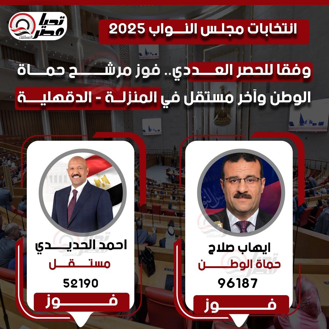 أسفر الحسر العددي في دائرة المنزلة بمحافظة الدقهلية عن فور المرشح ايهاب صلاح، مرشح حزب حماة الوطن، والمرشح المستقل أحمد الحديدي، وذلك بعد حصولهم على أعلى عدد من الأصوات في انتخابات جولة الإعادة من المرحلة الثانية لانتخابات مجلس النواب.