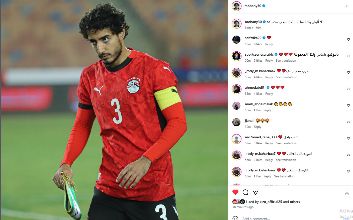 تحيا مصر، وكتب محمد هاني عبر حسابه الرسمي" إنستجرام": لا ألوان ولا انتماءات إلا لمنتخب مصر".