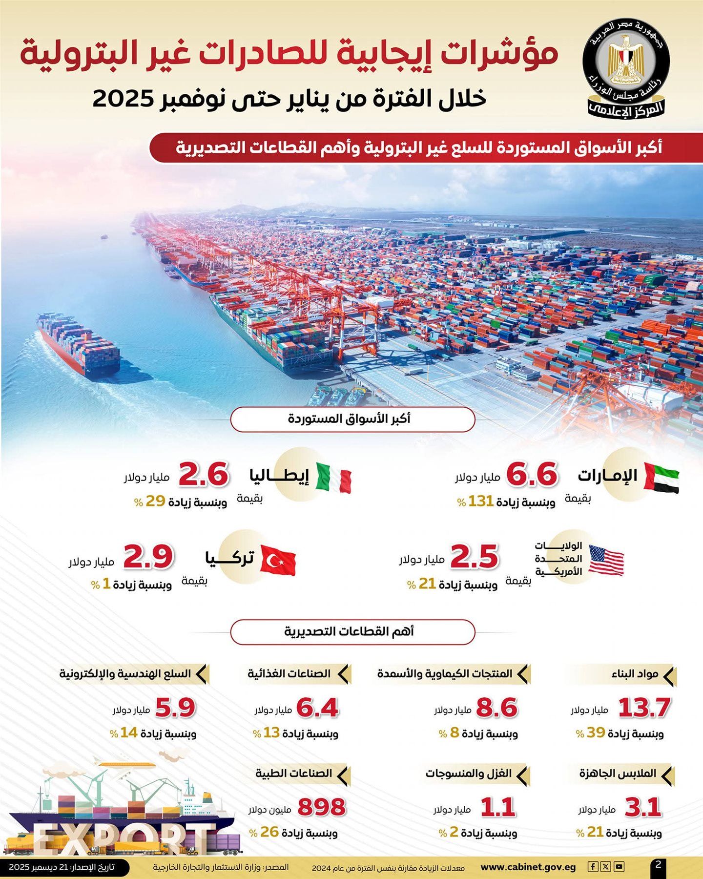 نشر المركز الإعلامي لمجلس الوزراء، عددًا من الإنفوجرافات عبر منصاته على مواقع التواصل الاجتماعي، استعرض من خلالها المؤشرات الإيجابية للصادرات غير البترولية خلال الفترة من يناير حتى نوفمبر 2025.