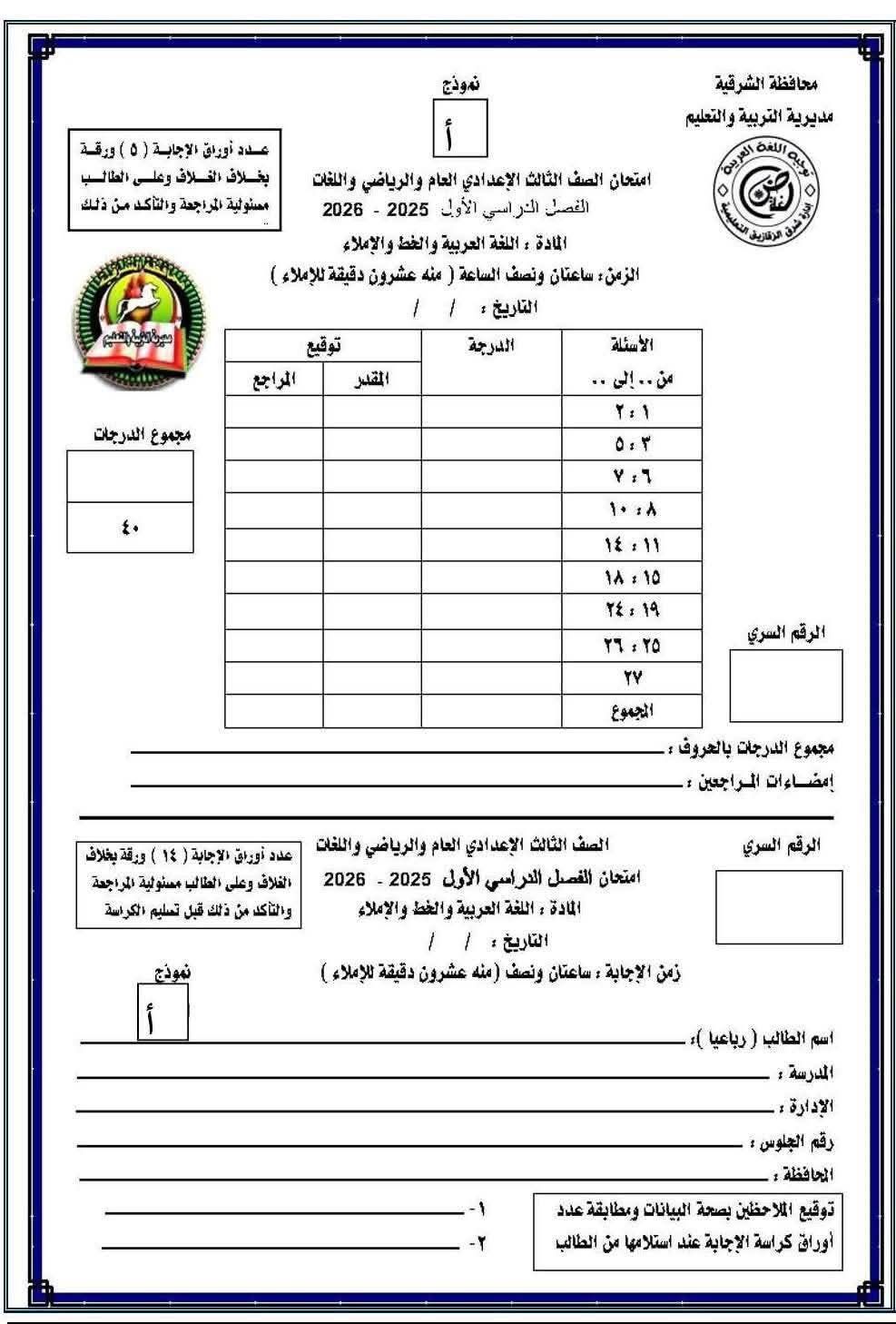ننشر نموذج امتحان اللغة العربية للصف الثالث الإعدادي 2026 الرسمي الترم الأول