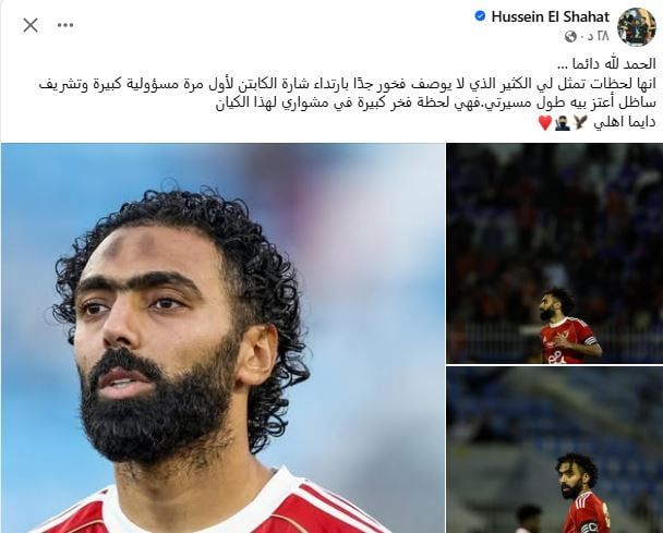وأضاف: "فخور جدًا بارتداء شارة الكابتن لأول مرة مسؤولية كبيرة وتشريف، سأظل أعتز بيه طول مسيرتي، فهي لحظة فخر كبيرة في مشواري لهذا الكيان.. دايما أهلي".