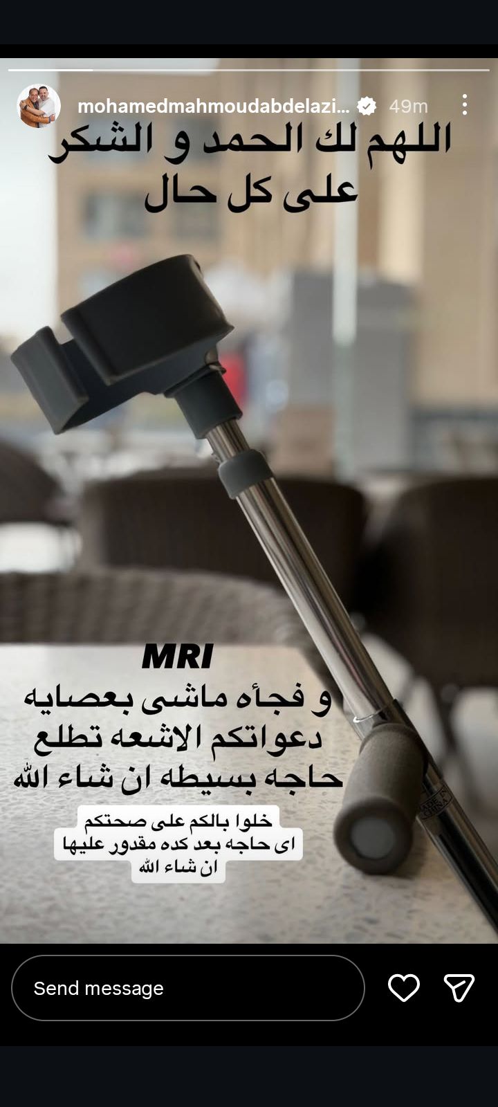 ونشر محمد محمود عبد العزيز صورة لـ عكاز على حسابه الرسمي بموقع تبادل الصور والفيديوهات انستجرام في منشور رصده موقع تحيا مصر، وعلق عليها، قائلا: "اللهم لك الحمد والشكر على كل حال، فاجأة بقيت أمشي بعصاية، دعواتكم الأشعة تطلع بسيطة أن شاءالله".