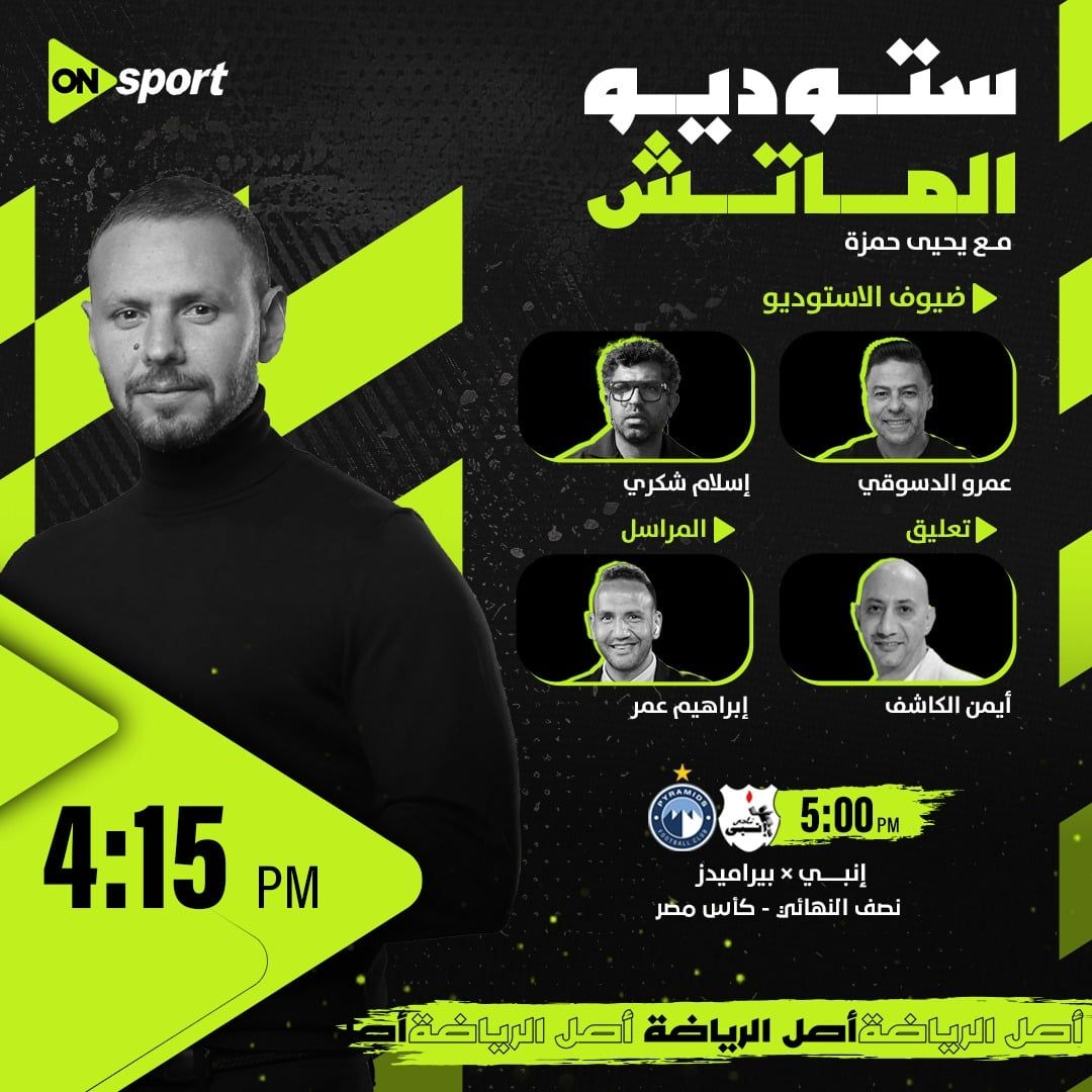 البداية عبر ستوديو تحليلي، يبدأ في تمام الساعة الرابعة والربع مساء، اليوم، الجمعة، عبر قناة أون سبورت 1، التي تذيع المباراة على الهواء مباشرة.