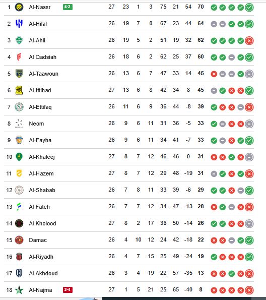 ترتيب الدوري السعودي.. جدول ترتيب دوري روشن السعودي بعد فوز النصر على النجمة