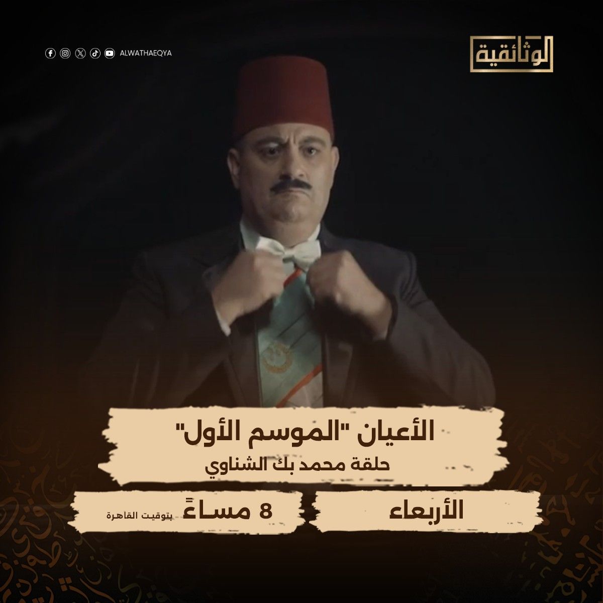 أعلن قطاع الإنتاج الوثائقي بالشركة المتحدة للخدمات الإعلامية عرض قناة "الوثائقية"، لإعادة عرض الموسم الأول من الفيلم الوثائقي "الأعيان"، عن محمد بك الشناوي، في الثامنة مساء اليوم بتوقيت القاهرة.