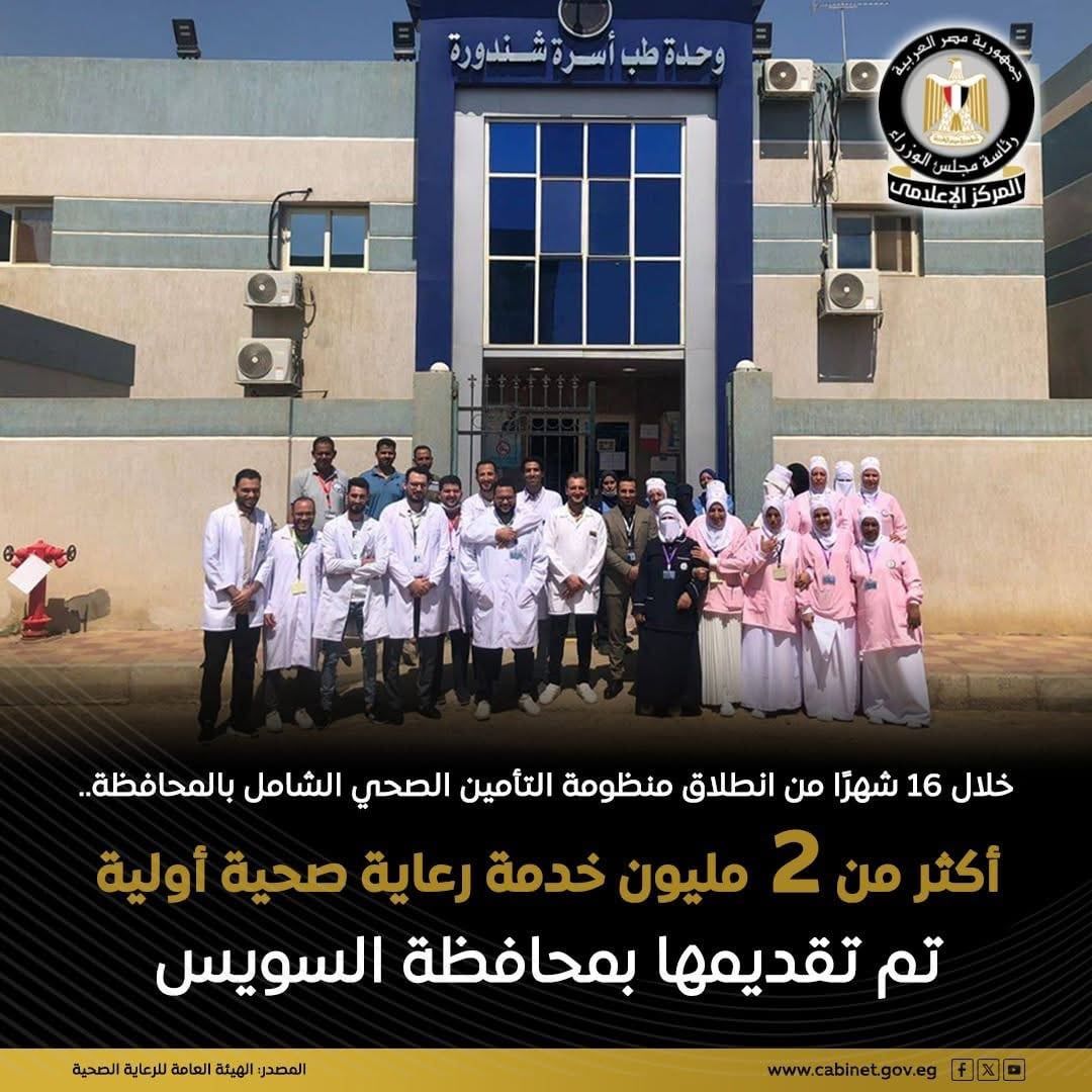 نشر المركز الإعلامي لمجلس الوزراء، إنفوجرافًا جديدًا يسلّط الضوء على النجاحات المتواصلة التي تحققها منظومة التأمين الصحي الشامل بمحافظة السويس، حيث أعلنت الهيئة العامة للرعاية الصحية عن تقديم أكثر من 2 مليون خدمة من خدمات الرعاية الصحية الأولية، عبر 26 وحدة ومركزًا لطب الأسرة، وذلك خلال 16 شهرًا فقط من بدء تطبيق المنظومة بالمحافظة.