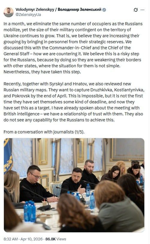 وقال زيلينسكي: "إنهم يريدون الاستيلاء على دروجكيفكا وكوستيانتينيفكا وبوكروفسك بحلول نهاية أبريل.. هذا مستحيل، لكنها ليست المرة الأولى التي يحددون فيها لأنفسهم مثل هذه المواعيد النهائية".
