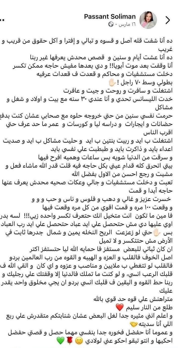 المنشور الذي اعتبره كثيرون بمثابة رسالة وداع غير مباشرة، كشف عن حجم المعاناة التي مرت بها، حيث تحدثت فيه عن سنوات طويلة من الصعوبات والتحديات التي واجهتها بمفردها، سواء على المستوى الأسري أو المهني أو الصحي. وأشارت إلى ما وصفته بـ"القسوة وقلة الأصل وأكل الحقوق"، مؤكدة أنها خاضت معارك عديدة دون سند، حتى بعد وفاة والدها، التي اعتبرتها نقطة فاصلة في حياتها.