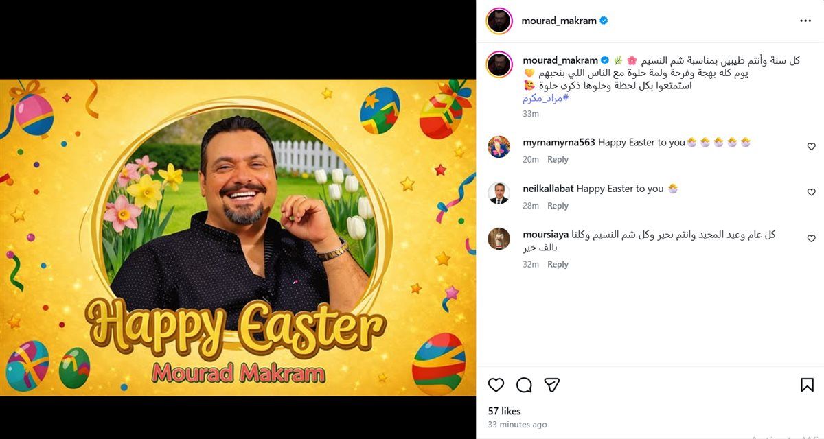 وشارك مراد مكرم صورة له عبر حسابه الرسمي على انستجرام، وعلق قائلًا: “كل سنة وأنتم طيبين بمناسبة شم النسيم، يوم كله بهجة وفرحة ولمة حلوة مع الناس اللي بنحبهم، استمتعوا بكل لحظة وخلوها ذكرى حلوة ”.
