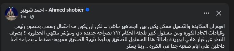 وأضاف شوبير قائلاً:" أن مثل هذه اللقطات قد تؤثر على صورة الكرة المصرية أمام الرأي العام المحلي والدولي، داعيًا إلى مراجعة أساليب التنظيم.