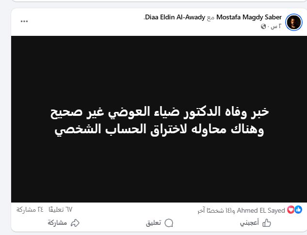 نشر المحامي مصطفى مجدي عبر صفحته الرسمية على موقع فيسبوك منشورًا أكد فيه عدم صحة ما تم تداوله بشأن وفاة موكله الدكتور ضياء العوضي، مشيرًا إلى وجود محاولات لسرقة أو اختراق الحسابات الشخصية.