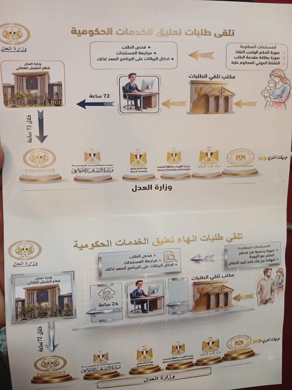 وأوضحت وزارة العدل أن المكاتب الجديدة تختص بتلقي طلبات الجهات المختصة بشأن تعليق الخدمات عن المحكوم عليهم الممتنعين عن سداد النفقة، تنفيذًا للقرار المنشور في الجريدة الرسمية، والذي يقضي بوقف عدد من الخدمات الحكومية عن المدينين، لحين سداد المستحقات المالية الواجبة عليهم.