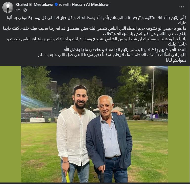 وتابع قائلاً:"ما هو يا حبيبي لو تشوف حجم الدعاء اللي الناس بتدعي ليك مش هتصدق قد ايه ربنا محبب فيك خلقه، كنت دايما بتقولي حب الناس من اكبر نعم ربنا سبحانه و تعالي، يلا يا بابا وحشتنا و مستنيك ان شاء الرحمن الشافي هترجع وسط عيلتك و احفادك و تفرح بقد ايه الناس بتحبك و خايفة عليك".