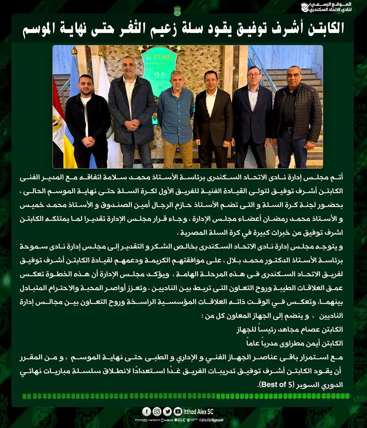 قرر مجلس إدارة نادي الاتحاد السكندري برئاسة محمد سلامة، إسناد مهمة تدريب فريق كرة السلة الأول "رجال"، إلى أشرف توفيق المدير الفني الحالي لسموحة.
