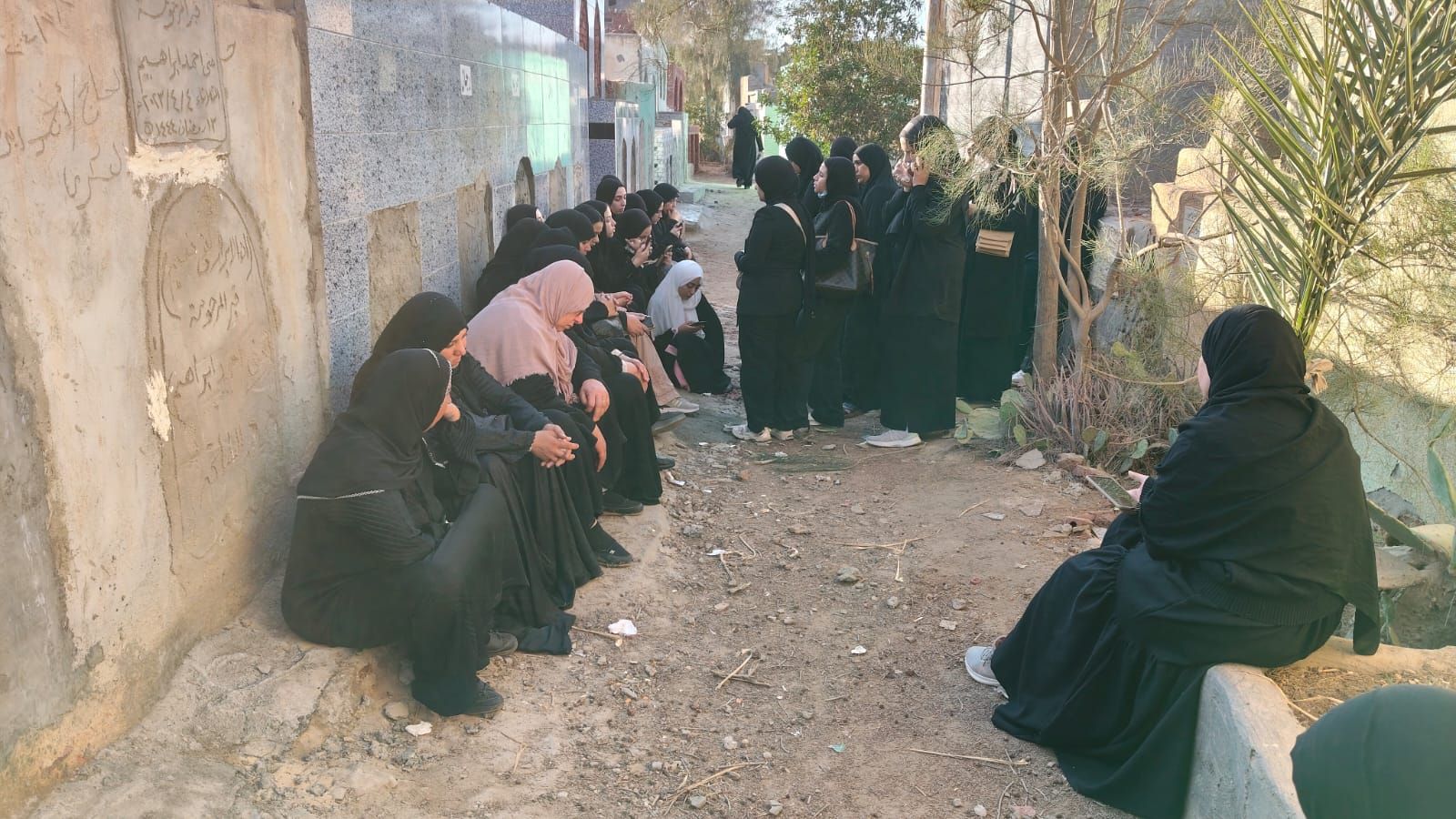 حرص عدد من أصدقاء وأقارب العروس "فرح" التي توفيت بعد ساعات من حفل زفافها بفستان الفرح بمركز أولاد صقر بمحافظة الشرقية، أمام قبربها بعد دفنها لقراءة القرآن الكريم والدعاء لها.