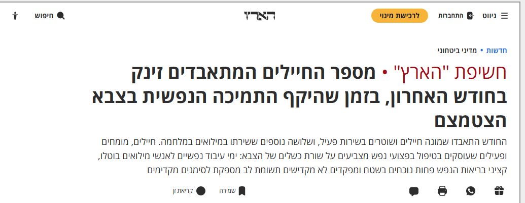 وتدعم البيانات هذه المخاوف، إذ كان متوسط عدد حالات الانتحار في الجيش خلال العقد الذي سبق حرب 7 أكتوبر نحو 12 حالة سنويًا، بينما ارتفعت الأعداد منذ ذلك الحين بشكل ملحوظ. فقد سُجلت سبع حالات بين 7 أكتوبر ونهاية عام 2023، وارتفع العدد إلى 21 حالة في عام 2024، ثم إلى 22 حالة في العام الذي تلاه، وهو أعلى رقم خلال خمسة عشر عامًا.