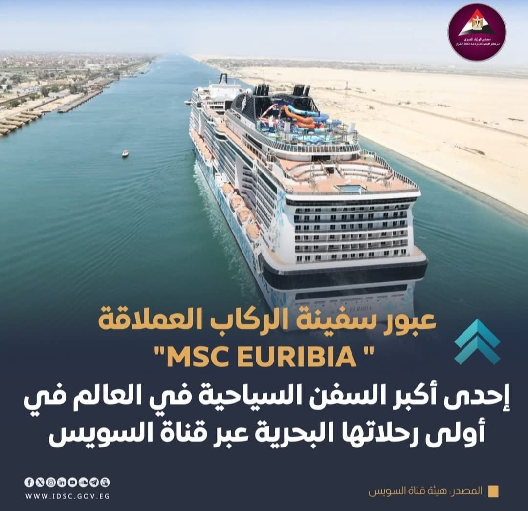 أعلنت الهيئة العامة لقناة السويس، في إنجاز جديد يُعزز مكانتها كممر ملاحي عالمي، عبور سفينة الركاب العملاقة "MSC EURIBIA" إحدى أكبر السفن السياحية في العالم، في أولى رحلاتها البحرية عبر قناة السويس ضمن قافلة الجنوب، وذلك بعد اجتيازها مضيق باب المندب خلال رحلتها القادمة من الإمارات العربية المتحدة والمتجهة إلى مالطا.