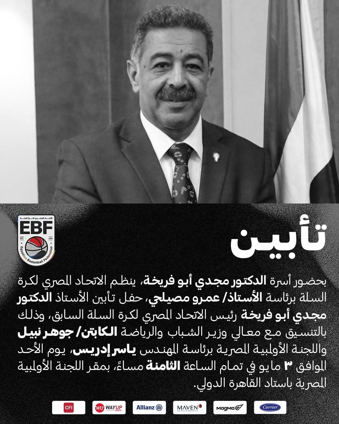 ويقام حفل التأبين برئاسة عمرو مصيلحي رئيس الاتحاد المصري لكرة السلة، وبالتنسيق مع معالي وزير الشباب والرياضة جوهر نبيل، وبمشاركة اللجنة الأولمبية المصرية برئاسة المهندس ياسر إدريس، في إطار تكريم أحد أبرز رموز اللعبة في مصر.