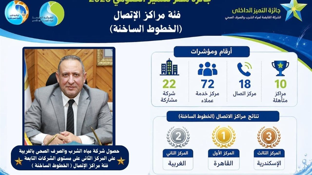 حصدت شركة مياه الشرب والصرف الصحى بالغربية بقيادة اللواء مهندس محمد عبد الفتاح، المركز الثاني بجائزه التميز الداخلي في فئة مراكز الاتصال (الخطوط الساخنة)، ضمن مسابقة نظمتها الشركة القابضة بالتعاون مع جائزة مصر للتميز الحكومي التابعة لوزارة التخطيط والتنمية الاقتصادية.
