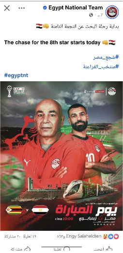 أعلن الحساب الرسمي للمنتخب الوطني الأول لكرة القدم، انطلاق رحلة البحث عن النجمة الثامنة ببطولة كأس الأمم الأفريقية، وذلك قبل المواجهة المرتقبة للفراعنة أمام منتخب زيمبابوي، وكتب حساب المنتخب عبر فيس بوك: بداية رحلة البحث عن النجمة الثامنة.