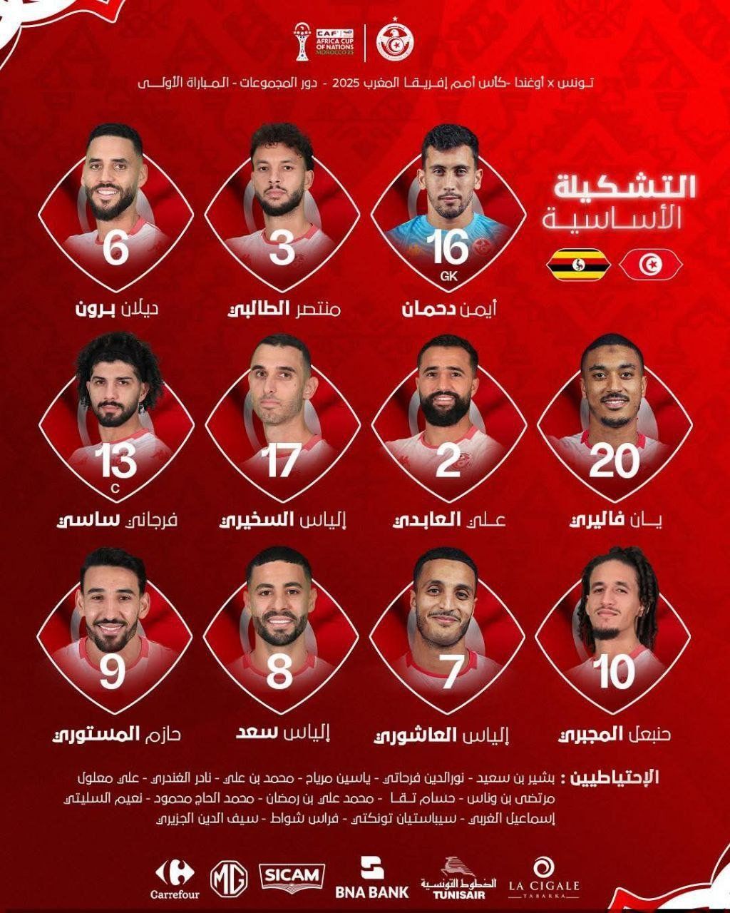 أعلن سامي الطرابلسي مدرب منتخب تونس عن التشكيل الرسمي الذي يقود به لقاء أوغندا، على ملعب "الأمير مولاي عبد الله" بالعاصمة المغربية "الرباط" أبوابه في العاشرة مساء اليوم، ضمن منافسات الجولة الأولى لدور المجموعات، في بطولة كأس أمم أفريقيا 2025 المقامة حاليًا في المغرب.