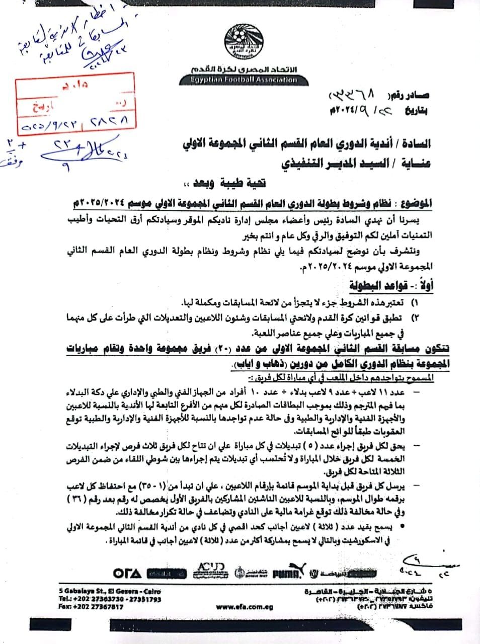 ويشارك في دوري المحترفين موسم 2024- 2025، أندية «لافيينا، وادي دجلة، السكة الحديد، طنطا، القناة، راية، بروكسي، بترول أسيوط، أبوقير للأسمدة، المصرية للاتصالات، أسوان، الترسانة، ديروط، كهرباء الإسماعيلية، منتخب السويس، سبورتنج، المنصورة، الداخلية، المقاولون العرب، بلدية المحلة».