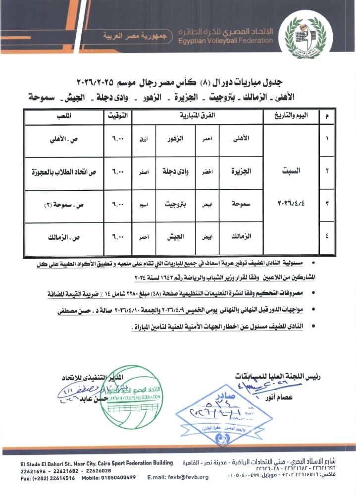 اعتمدت لجنة المسابقات بإتحاد الكرة الطائرة جدول مباريات ربع نهائي كأس مصر للرجال للموسم المحلي 2025-2026 .