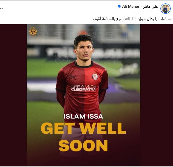 حرص على ماهر المدير الفنى لفريق سيراميكا، على دعم لاعبه إسلام عيسى بعد إصابته بقطع في الرباط الصليبى خلال مشاركته مع المنتخب أمام إسبانيا في المباراة الودية التي انتهت بالتعادل السلبى.