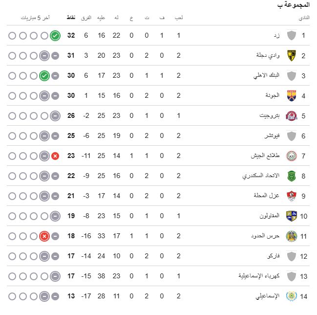 حافظ فريق الكرة الأول بنادي زد على صدارته لترتيب مجموعة الهبوط بالدوري المصري، برصيد 32 نقطة، وذلك قبل ختام منافسات الجولة الثانية من الدور الثاني بمجموعة الهبوط.