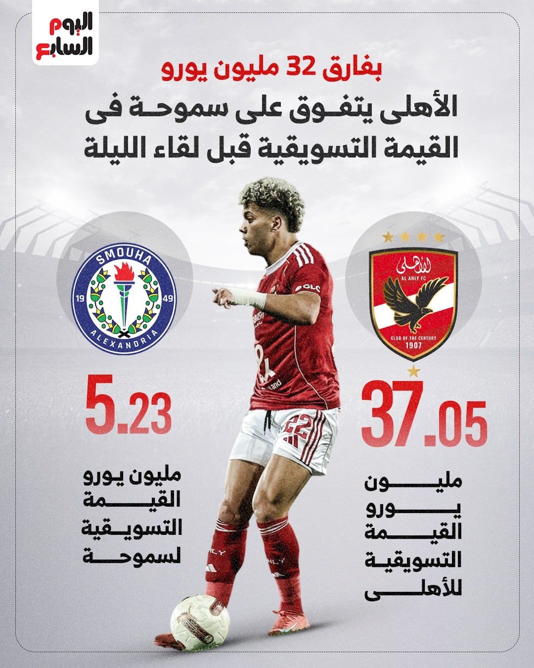 تبلغ القيمة التسويقية لفريق الأهلى 37.05 مليون يورو، فيما تبلغ القيمة التسويقية لفريق سموحة 5.23 مليون يورو.