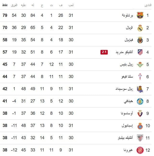 ترتيب الدوري الإسباني بعد مباريات الجولة 31: