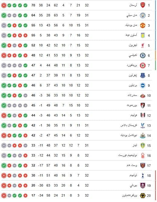 ويأتي جدول ترتيب الدوري الإنجليزي الممتاز كالتالي: