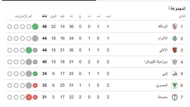 وحصل فريق الزمالك على راحة من مباريات الجولة الثانية وفقاً لنظام البطولة، إلا أن الفريق الأبيض ما زال يحتفظ بصدارته لجدول ترتيب البطولة برصيد 46 نقطة، بفارق نقطتين عن بيراميدز والأهلي أقرب منافسيه.