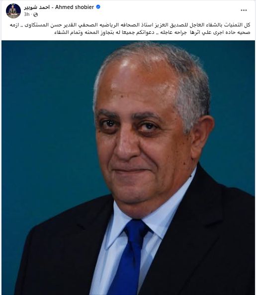 وكتب أحمد شوبير على صفحته الشخصية بفيس بوك :" كل التمنيات بالشفاء العاجل للصديق العزيز أستاذ الصحافة الرياضية الصحفي القدير حسن المستكاوى .. أزمه صحية حادة أجرى علي إثرها جراحة عاجلة .. دعواتكم جميعا له بتجاوز المحنه وتمام الشفاء".