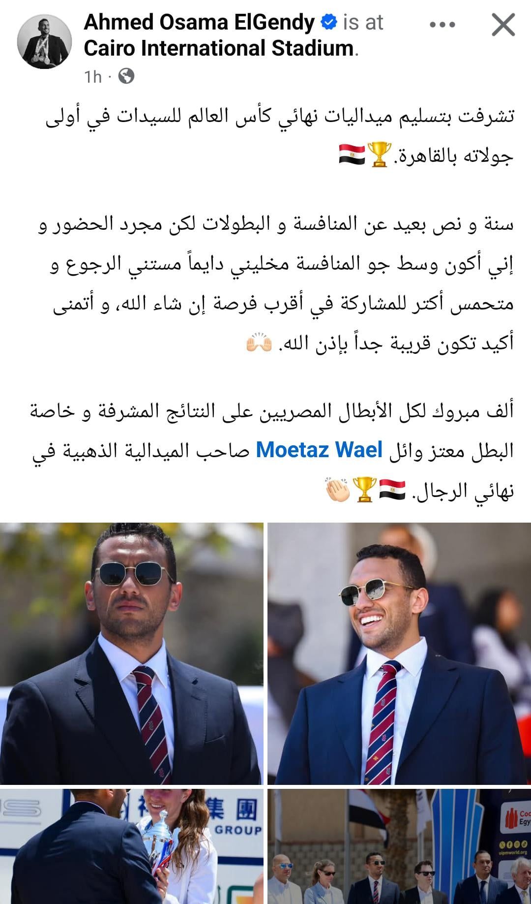 وحرص الجندي على تهنئة أبطال مصر على النتائج المميزة التي حققوها في البطولة، مشيدًا بالأداء المشرف الذي يعكس تطور اللعبة محليًا، كما وجه تهنئة خاصة إلى معتز وائل بعد تتويجه بالميدالية الذهبية في نهائي الرجال، مؤكدًا فخره بما يقدمه نجوم مصر من إنجازات على الساحة الدولية.