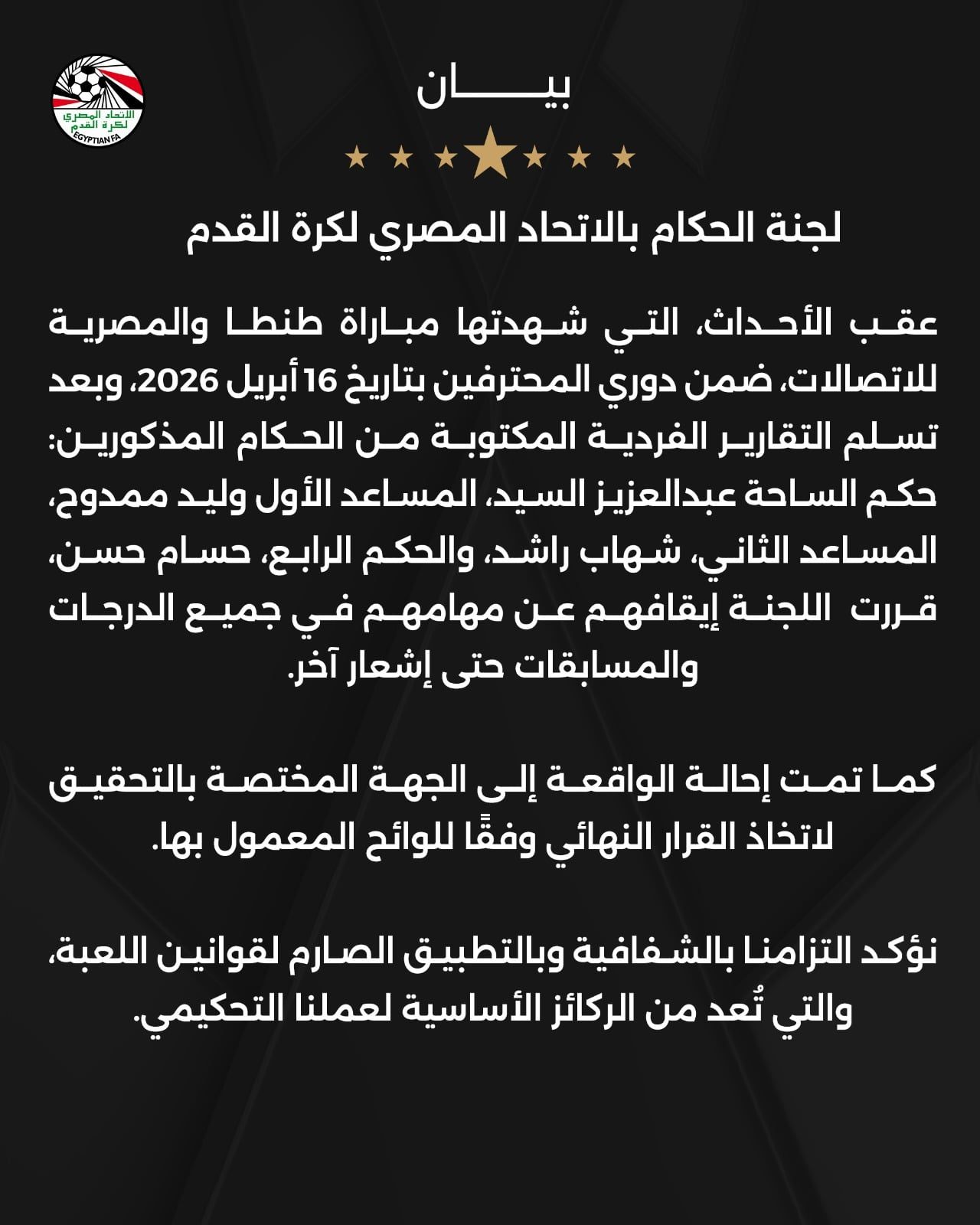 عقب الأحداث، التي شهدتها مباراة طنطا والمصرية للاتصالات، ضمن دوري المحترفين بتاريخ 16 أبريل 2026، وبعد تسلم التقارير الفردية المكتوبة من الحكام المذكورين: حكم الساحة عبدالعزيز السيد، المساعد الأول وليد ممدوح، المساعد الثاني، شهاب راشد، والحكم الرابع، حسام حسن، قررت اللجنة إيقافهم عن مهامهم في جميع الدرجات والمسابقات حتى إشعار آخر.