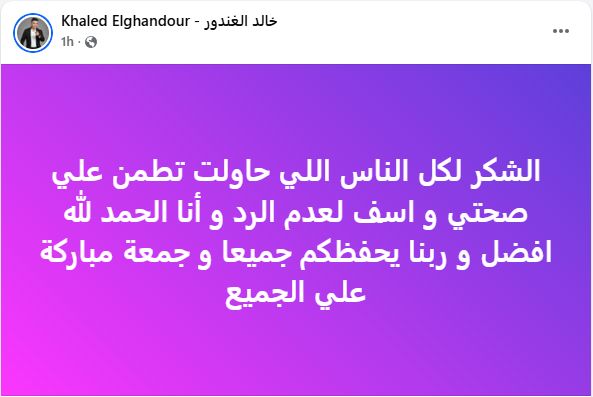 وحرص خالد الغندور على طمـأنة الجماهير بعد مغادرته المستشفي، حيث كتب على صفحته الشخصية: "الشكر لكل الناس اللي حاولت تطمن علي صحتي وأسف لعدم الرد وأنا الحمد لله افضل وربنا يحفظكم جميعا وجمعة مباركة علي الجميع".