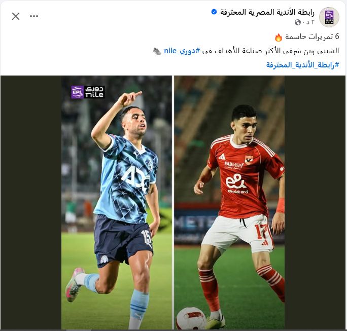 نشرت صفحة رابطة الأندية المحترفة عبر فيس بوك صورة تجمع المغربي أشرف بن شرقي لاعب الأهلي مع مواطنه محمد الشيبي لاعب بيراميدز، وعلّقت عليها: 6 تمريرات حاسمة الشيبي وبن شرقي الأكثر صناعة للأهداف في دوري_nile .