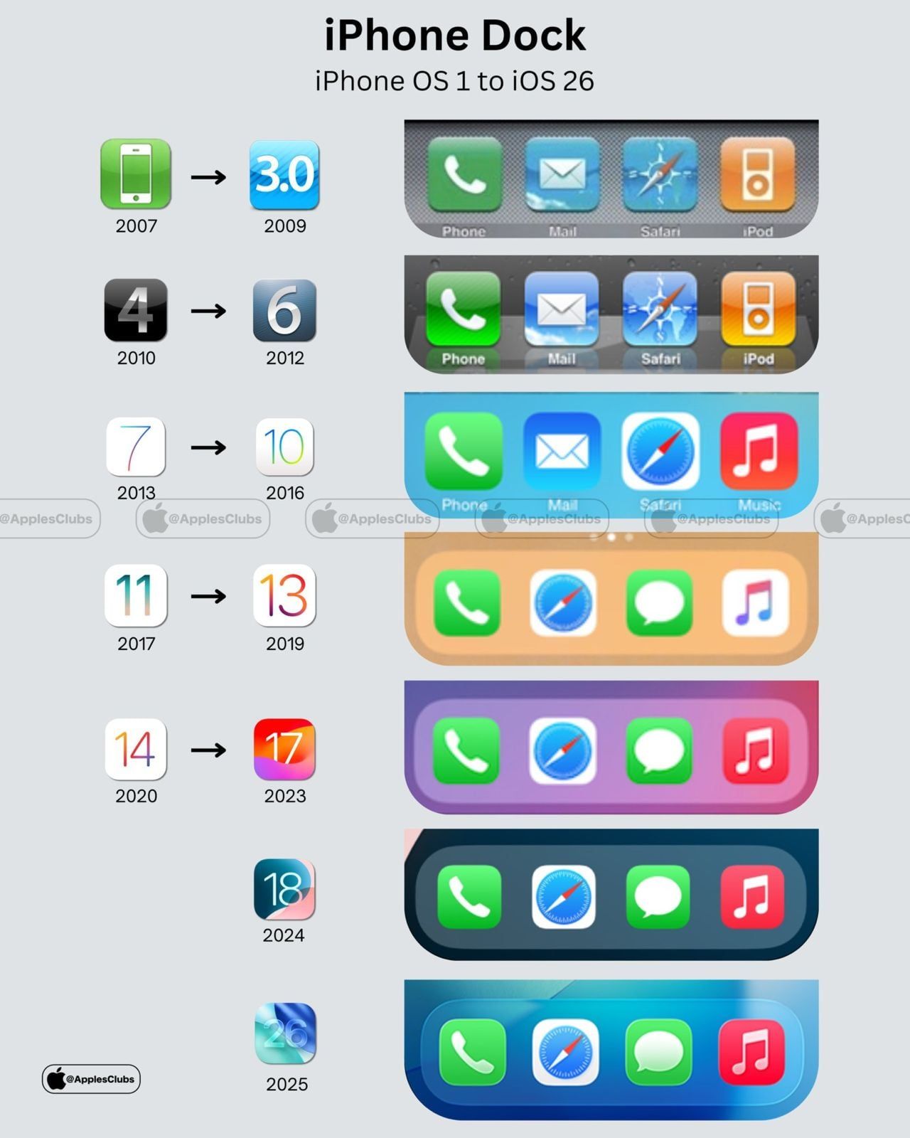 تُظهر الصور المتداولة التطور الكبير الذي شهده Dock عبر إصدارات iOS المختلفة، من تصميم بسيط وثابت إلى واجهة تفاعلية حديثة تتماشى مع أحدث توجهات التصميم.
