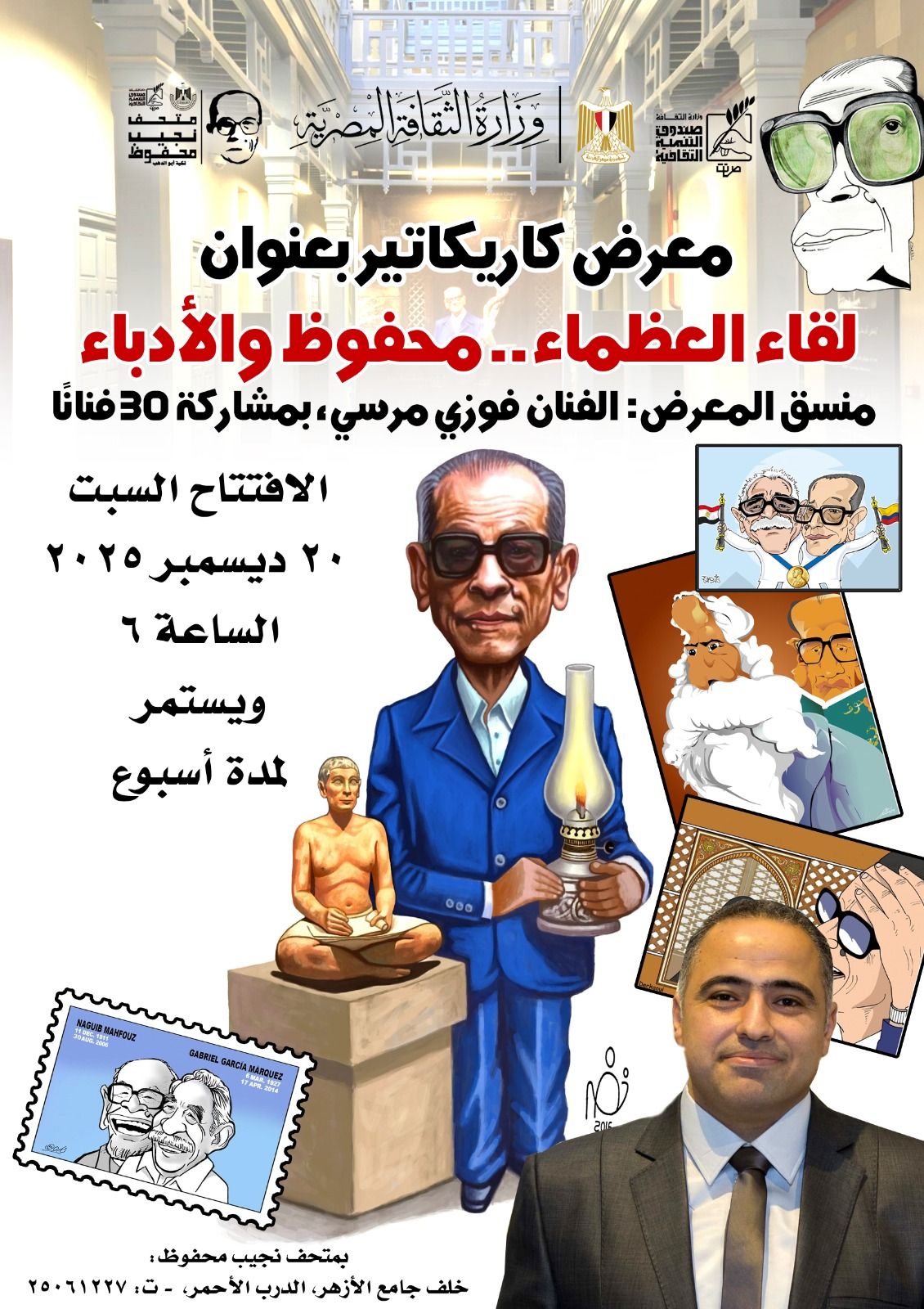 فى إطار فعاليات متحف ومركز ابداع نجيب محفوظ، بتكية محمد أبو الدهب، التابع لصندوق التنمية الثقافية، وبمناسبة مرور 144 عاما على ميلاد نجيب محفوظ، يفتتح فى السادسة من مساء غدا السبت بمتحف نجيب محفوظ معرض البورتريه الكاريكاتيري "لقاء العظماء .. محفوظ والأدباء" والذي يحتفي برموز الأدب العالمي.