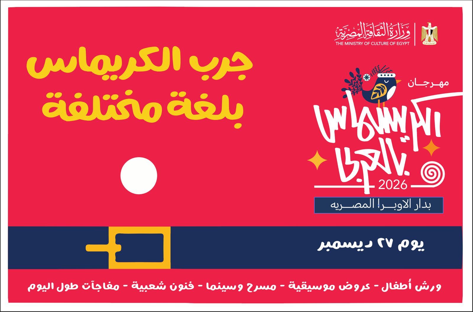 تُنظم وزارة الثقافة يوم السبت 27 ديسمبر فعاليات مهرجان كريسماس بالعربي، بمشاركة مختلف قطاعات الوزارة، وذلك اعتبارًا من الحادية عشرة صباحًا على عدد من مسارح وساحات دار الأوبرا المصرية.