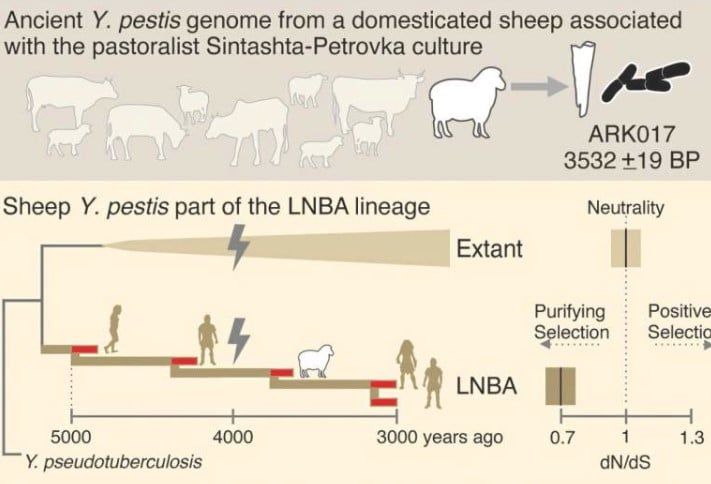 توصل فريق دولي من الباحثين، من بينهم عالم الآثار تايلور هيرمس من جامعة أركنساس، إلى أول دليل على إصابة حيوان غير بشري بطاعون العصر البرونزي، فقد اكتشف العلماء الحمض النووي لبكتيريا يرسينيا الطاعونية في خروف مستأنس عمره 4000 عام من أركايم، وهي مستوطنة محصنة تقع في جبال الأورال الجنوبية في روسيا الحالية بالقرب من حدود كازاخستان، ويمثل هذا الاكتشاف حلقة مفقودة في فهم كيفية انتشار طاعون العصر البرونزي على نطاق واسع.