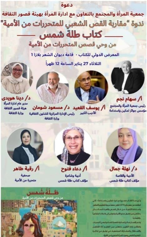 يستضيف معرض القاهرة للكتاب بدورته 57، ندوة مقاربة القص الشعبى للمتحررات من الأمية - كتاب طلة شمس، تنظيم جمعية المرأة والمجتمع بالتعاون مع الهيئة العامة لقصور الثقافة، يوم الثلاثاء 27 يناير، في قاعة ديوان الشعر، بلازا 1، فى تمام الساعة الثانية عشر ظهرا.