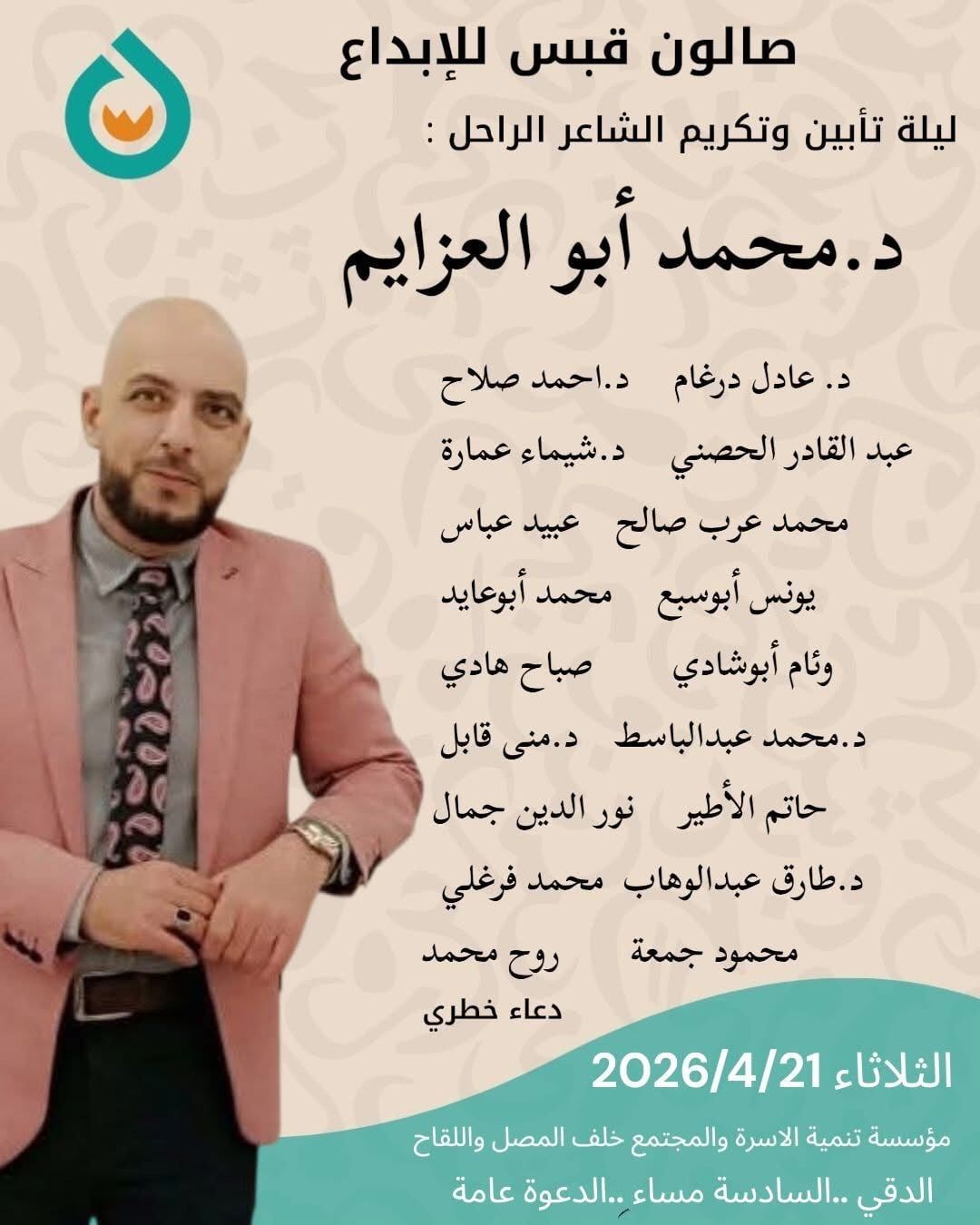 ويأتى حفل التأبين في إطار تقدير رحلة الشاعر محمد أبو العزايم، رحل عن عالمنا الشاعر الشاب محمد أبو العزايم بعد مسيرة مؤثرة في عالم الشعر والإبداع ترك خلالها بصمة واضحة في المشهد الشعري المعاصر