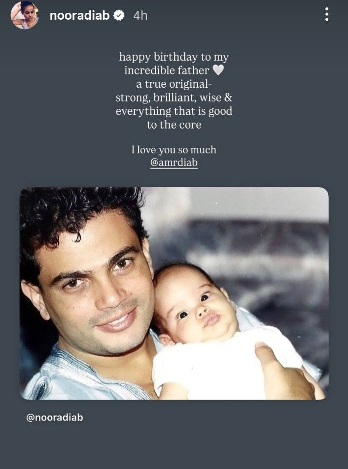 نشرت نور عمرو دياب عبر حسابها الرسمي على موقع انستجرام صورة قديمة تجمعها بوالدها من طفولتها، احتفالًا بعيد ميلاده الـ64، حيث احتفلت بعيد ميلاد الهضبة الذي يحل علينا اليوم ووجهت له رسالة مؤثرة تعبر عن مدى تعلقها به وحبها الشديد له وفخرها بنجاحه وإنجازاته.
