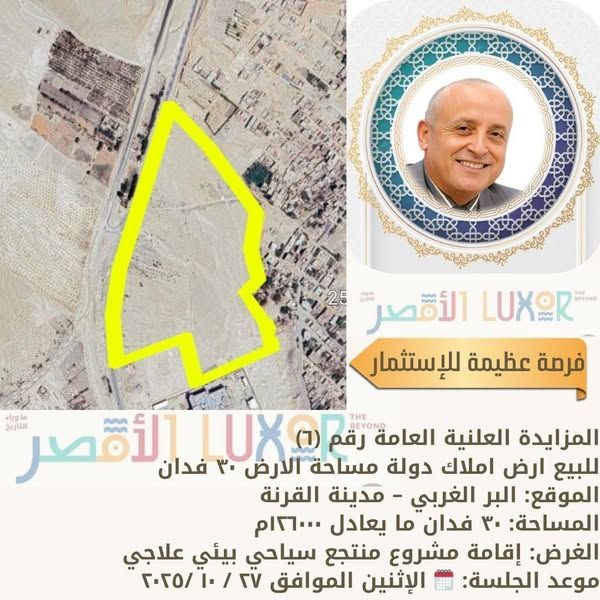 ثانياً : المزايدة العلنية العامة رقم (7): لبيع قطعة أرض بمساحة 5 أفدنة (ما يعادل 21,000 متر مربع) بالبر الغربي بمدينة القرنة، لإقامة منتجع سياحي، وتُعقد جلسة المزايدة يوم الثلاثاء الموافق 28 أكتوبر 2025.