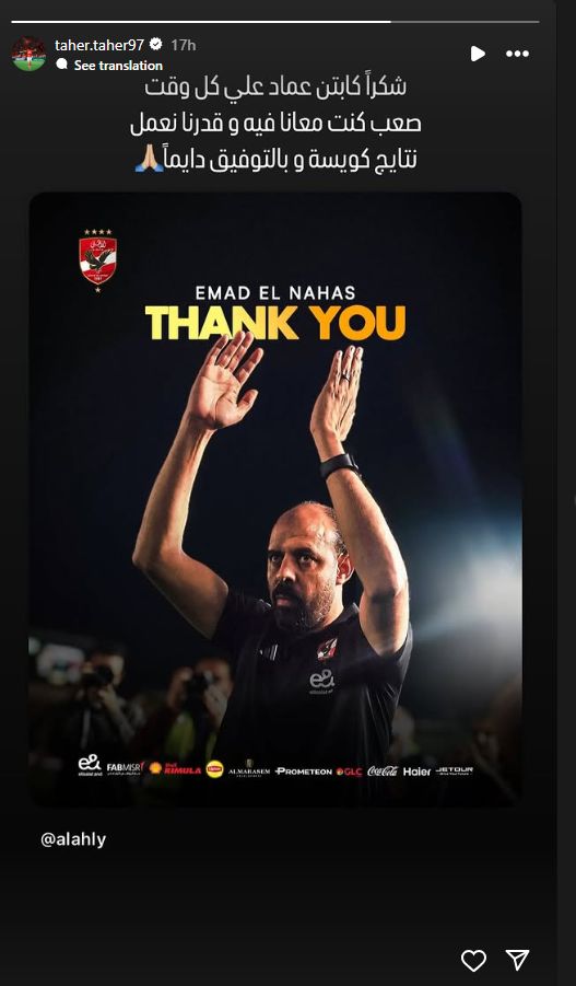 تحيا مصر، وكتب طاهر محمد طاهر عبر حسابه الرسمي"انستجرام": شكراً كابتن عماد علي كل وقت صعب كنت معانا فيه، وقدرنا نعمل نتائج كويسة وبالتوفيق دايماً".