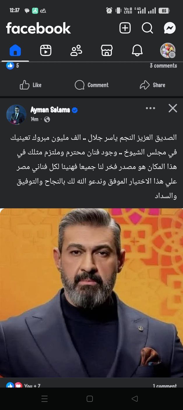 وكتب أيمن سلامة عبر صفحته الرسمية على موقع التواصل الاجتماعي فيسبوك قائلًا: "الصديق العزيز النجم ياسر جلال.. ألف مليون مبروك تعيينك في مجلس الشيوخ.. وجود فنان محترم وملتزم مثلك في هذا المكان هو مصدر فخر لنا جميعًا، فهنيئًا لكل فناني مصر على هذا الاختيار الموفق، وندعو الله لك بالنجاح والتوفيق والسداد".
