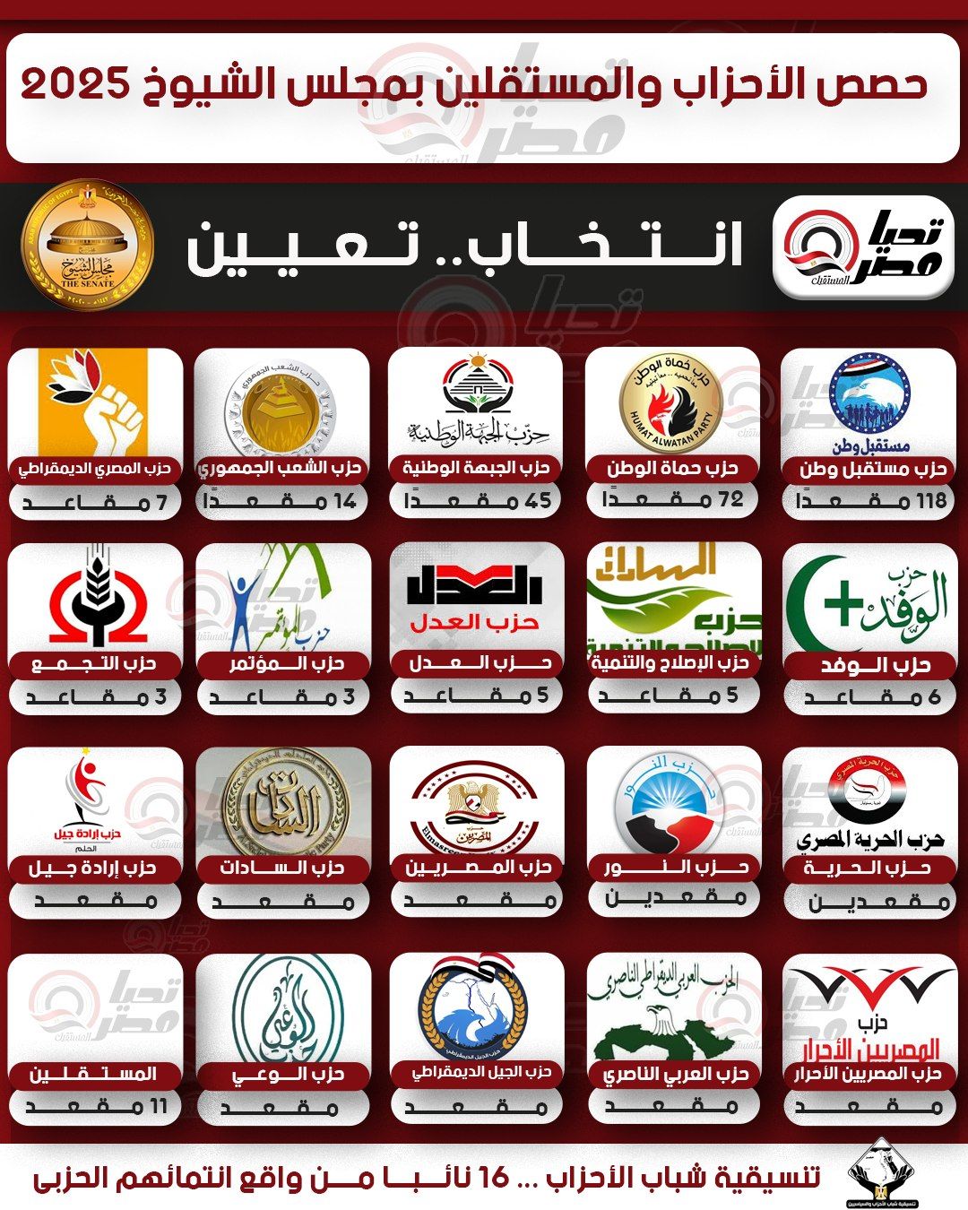 رصد موقع تحيا مصر حصص الأحزاب والقوى السياسية بمجلس الشيوخ بعد الاكتمال الخاص بالتعيين من جانب رئيس الجمهورية حيث يتكون من 300 مقعد وجاء حزب مستقبل فى المقدمة