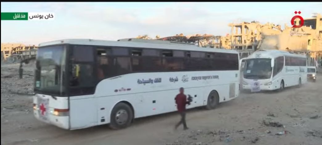 عرضت فضائية "القاهرة الإخبارية"، خلال بثها المباشر، حركة سير ودخول سيارات تابعة للجنة الدولية للصليب الأحمر لنقل الأسرى الفلسطينيين إلى قطاع غزة ضمن المرحلة الأولى من عملية اتفاق تبادل الأسرى والمحتجزين.